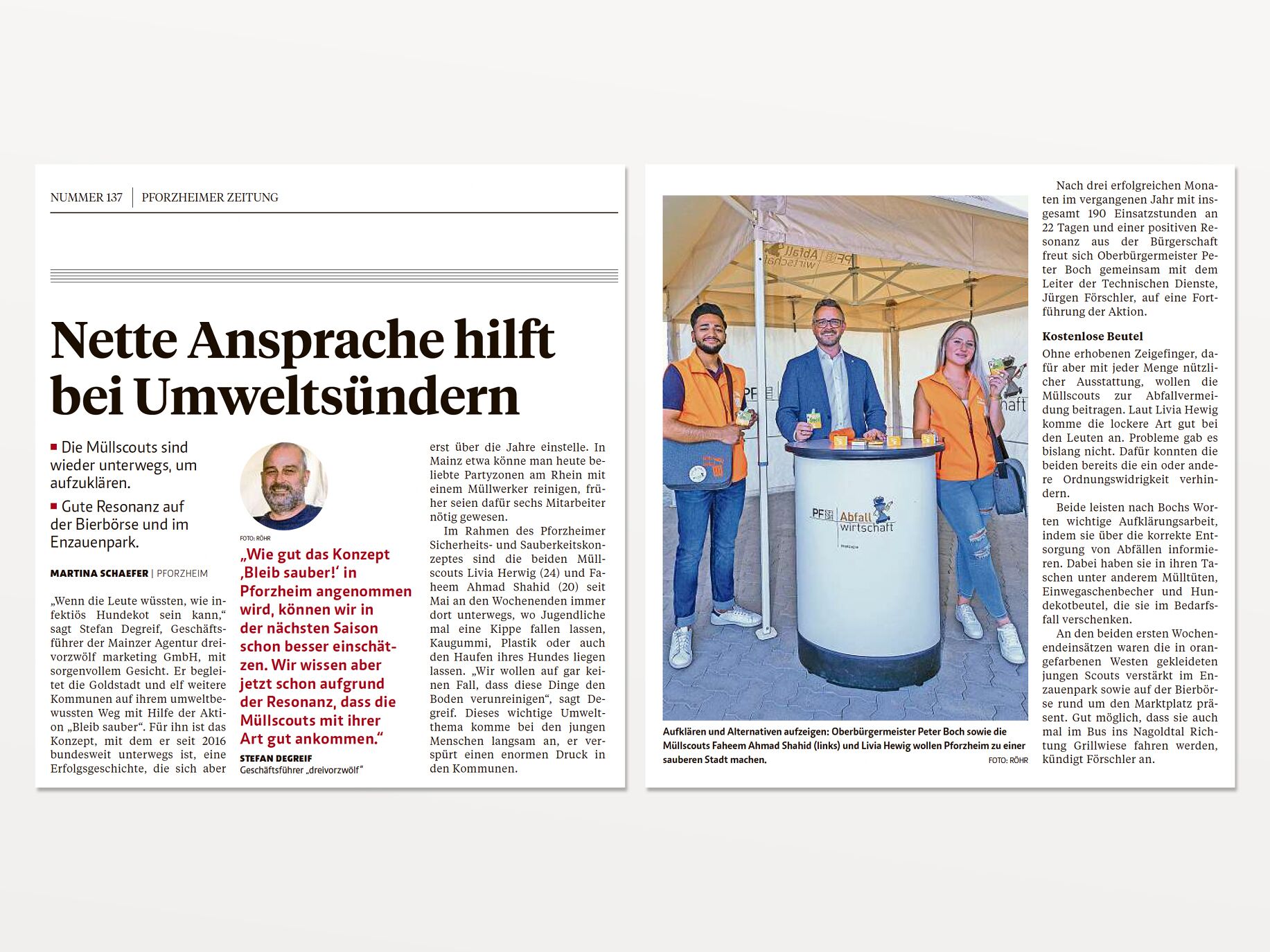 Mehr Achtsamkeit in der Müllprävention wünscht sich auch die Stadt Pforzheim und setzt seit Sommer 2021 unser Bleib sauber!©-Umweltscout-Konzept um. Unsere Pforzheimer Umweltscouts erreichen die Bürger persönlich und können aufmerksamkeitsstark motivieren und dazu bewegen, umweltbewusst und verantwortungsvoll mit dem eigenen Umfeld umzugehen.