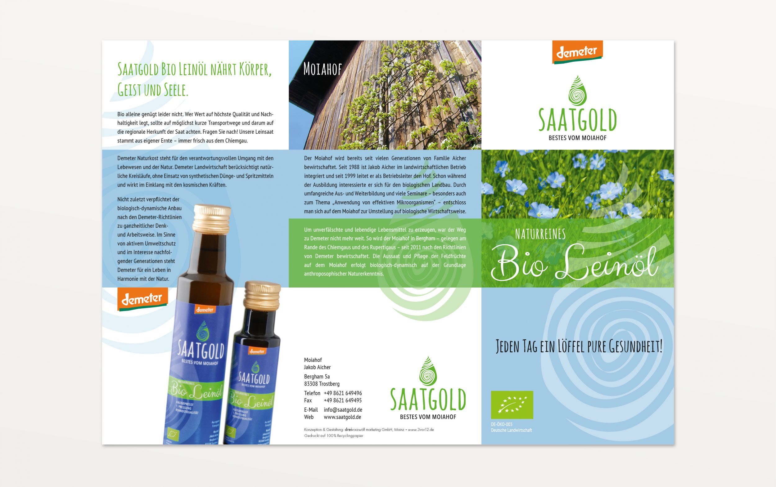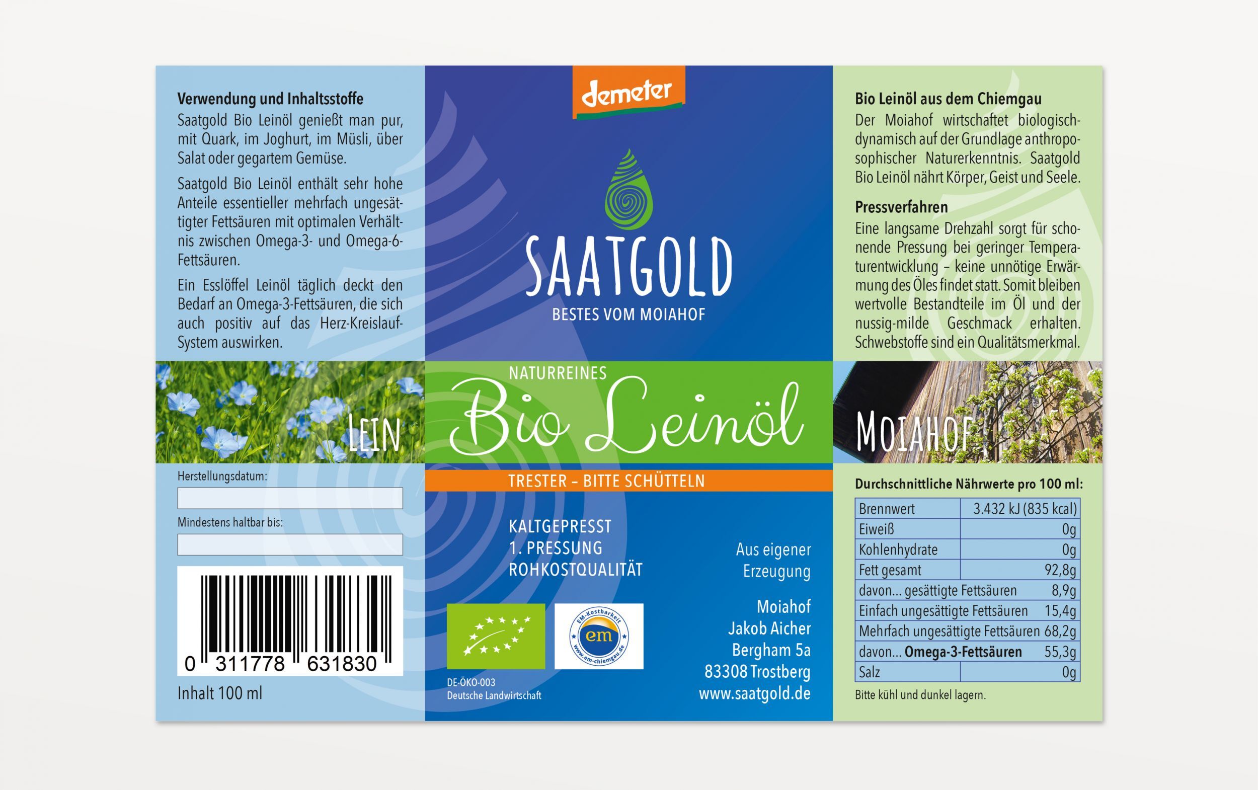 Durch umfangreiche Aus- und Weiterbildung und viele Seminare entschloss man sich auf dem Moiahof zur Umstellung auf biologische Wirtschaftsweise. Saatgold Leinöl ist ein wertvolles, nussig-mildes Leinöl und sorgt für Lebensenergie in Form von ungesättigten Omega-3-Fettsäuren.